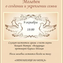 9 октября в 18.00 в храме иконы Божией Матери “Всецарица” (ул. Грушевская, 50) будет совершаться молебен о создании и укреплении семьи. После молебна состоится беседа с настоятелем храма протоиереем Кириллом Шолковым на тему “Отношения до брака”, где каждый желающий сможет задать вопросы. На молебнах о создании и укреплении семьи каждый может помолиться Господу Иисусу Христу о даровании любви, создании счастливой семьи, укреплении существующего союза. Приглашаем всех принять участие в совместной молитве!