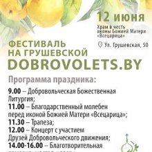 12 июня по случаю первого юбилея добровольческого движения состоится "Фестиваль на Грушевской DOBROVOLETS.BY". Мероприятие начнется в 9.00 с Божественной Литургии. В 11.00 пройдет благодарственный молебен перед иконой Божией Матери "Всецарица". После этого всех присутствующих ждет совместная трапеза, концерт с участием друзей добровольческого движения, благотворительная ярмарка, мастер-классы, а также приятное общение и позитивные эмоции. Принять участие в мероприятии может любой желающий!