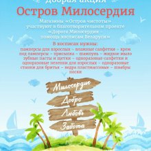 24 июня в магазинах сети "Остров чистоты" прошла акция "Остров Милосердия". В результате удалось собрать вещи и средства гигиены для пациентов хосписов. Магазины «Остров чистоты» участвуют в благотворительном проекте «Дорога Милосердия - помощь хосписам Беларуси». Подобные акции теперь станут регулярными. Спешите делать добро!