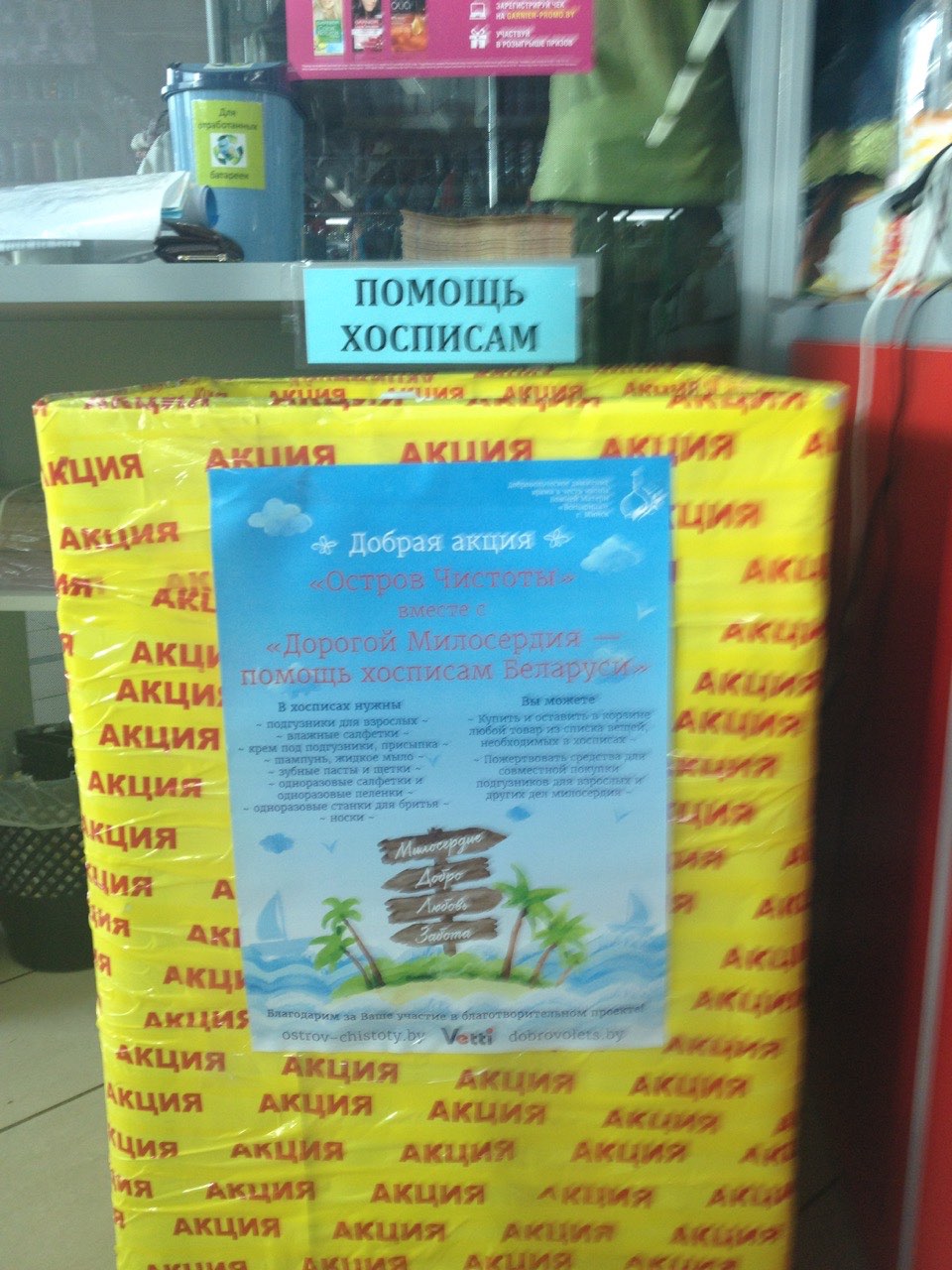 В магазинах сети "Остров чистоты", расположенных в Минске, продолжается акция «Остров чистоты» вместе с «Дорогой Милосердия – помощь хосписам Беларуси», стартовавшая 15 августа. Целью акции является сбор вещей и средств гигиены для пациентов хосписов Беларуси. Для этого в каждом дискаунтере «Остров чистоты» установлены специальные корзины для сбора всех необходимых вещей.