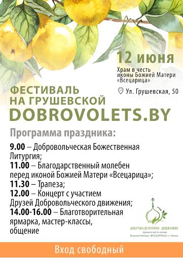 12 июня по случаю первого юбилея добровольческого движения состоится "Фестиваль на Грушевской DOBROVOLETS.BY". Мероприятие начнется в 9.00 с Божественной Литургии. В 11.00 пройдет благодарственный молебен перед иконой Божией Матери "Всецарица". После этого всех присутствующих ждет совместная трапеза, концерт с участием друзей добровольческого движения, благотворительная ярмарка, мастер-классы, а также приятное общение и позитивные эмоции. Принять участие в мероприятии может любой желающий!