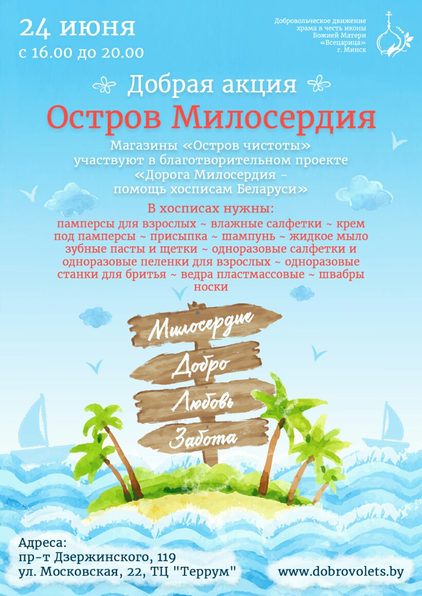 24 июня с 16.00 до 20.00 пройдёт акция по сбору средств гигиены и памперсов в магазинах сети "Остров чистоты", расположенных на пр. Держинского, 119 и ул. Московской, 22 (ТЦ "Террум"). Магазины «Остров чистоты» участвуют в благотворительном проекте «Дорога Милосердия - помощь хосписам Беларуси».