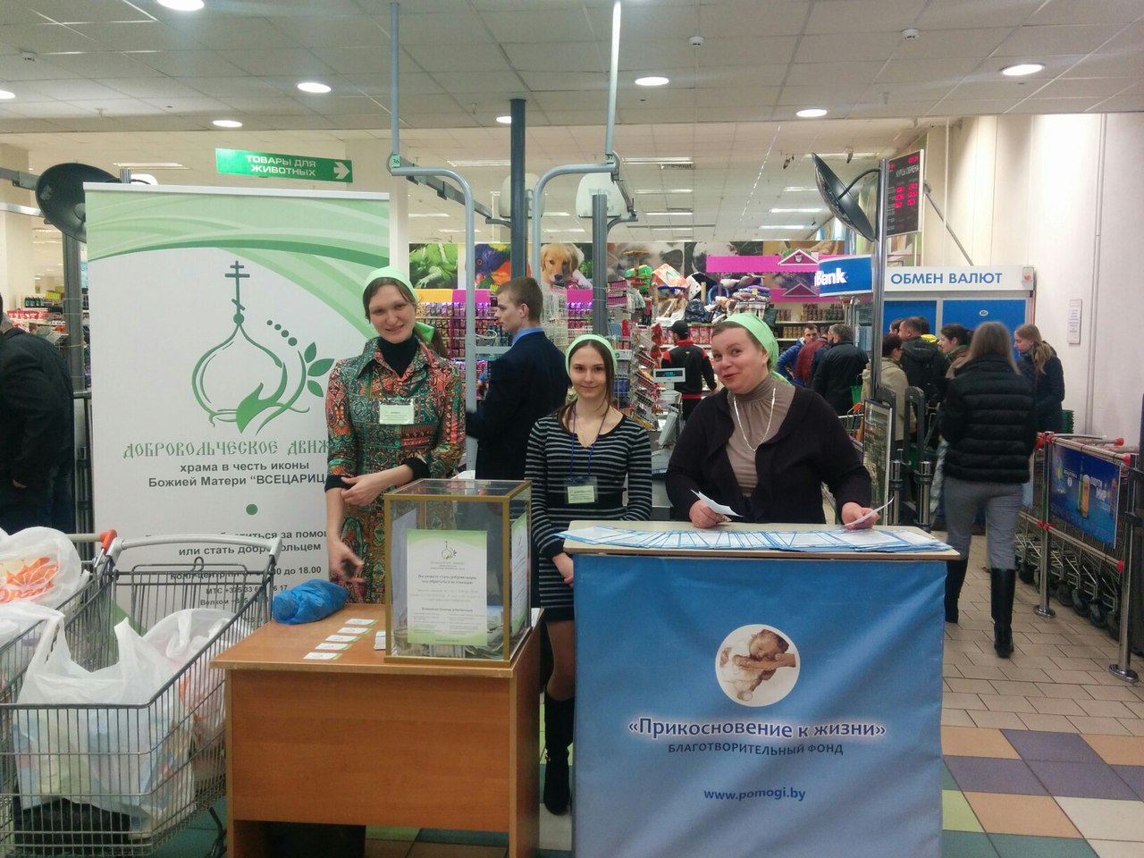 22 апреля в ТЦ "Корона" прошла совместная акция благотворительного фонда «Прикосновение к жизни» и Добровольческого движения помощи онкобольным храма иконы Божией Матери «Всецарица». Волонтеры знакомили посетителей с деятельностью движения, а также со списком вещей, необходимых пациентам хосписов. Все желающие смогли пожертвовать памперсы для взрослых, влажные салфетки, жидкое мыло, одноразовые салфетки, одноразовые станки для бритья, машинки для стрижки волос и другие необходимые вещи, сотворив доброе дело в преддверии Светлого праздника Пасхи.