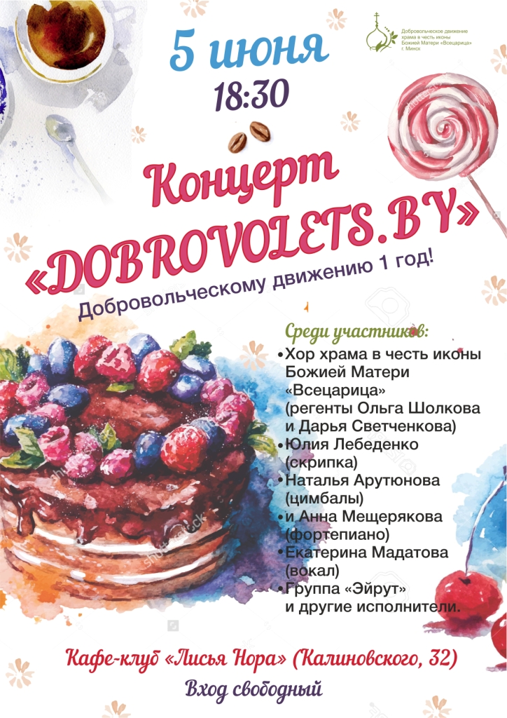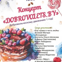 В июне добровольческому движению храма иконы Божией Матери "Всецарица" исполняется 1 год. 5 июня в 18.30 в кафе-клубе "Лисья нора" (ул. Калиновского, 32) состоится концерт "DOBROVOLETS.BY", приуроченный к годовщине существования движения. В программе концерта выступления хора храма в честь иконы Божией Матери "Всецарица" (регенты Ольга Шолкова и Дарья Светченкова), Юлии Лебеденко (скрипка), Натальи Арутюновой (цимбалы), Анны Мещеряковой (фортепиано), Екатерины Мадатовой (вокал), Светланы Стефаненко (фортепиано), группы "Эйрут" и других исполнителей. Вход на концерт по предварительной записи по телефону + 375 33 626-16-17 (Ирина).