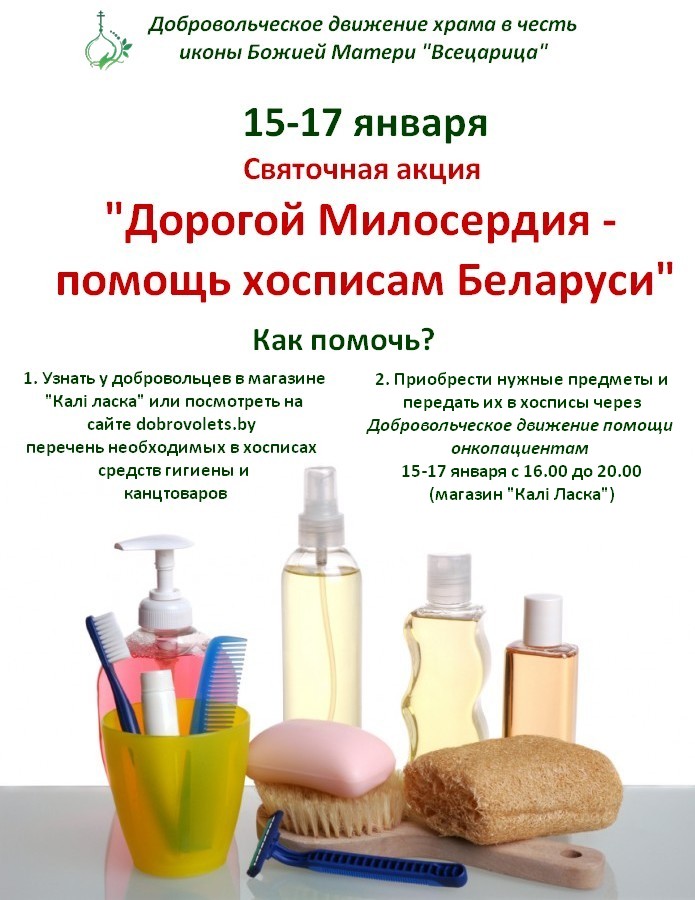 С 16 по 17 января 2016 года в минском магазине “Калi Ласка” прошла Святочную акцию “Дорогой Милосердия – помощь хосписам Беларуси”. Ее организаторами стали добровольцы храма в честь иконы Божией Матери “Всецарица” при поддержки Синодального отдела по церковной благотворительности и социальному служению БПЦ и ряда учреждений здравоохранения.
