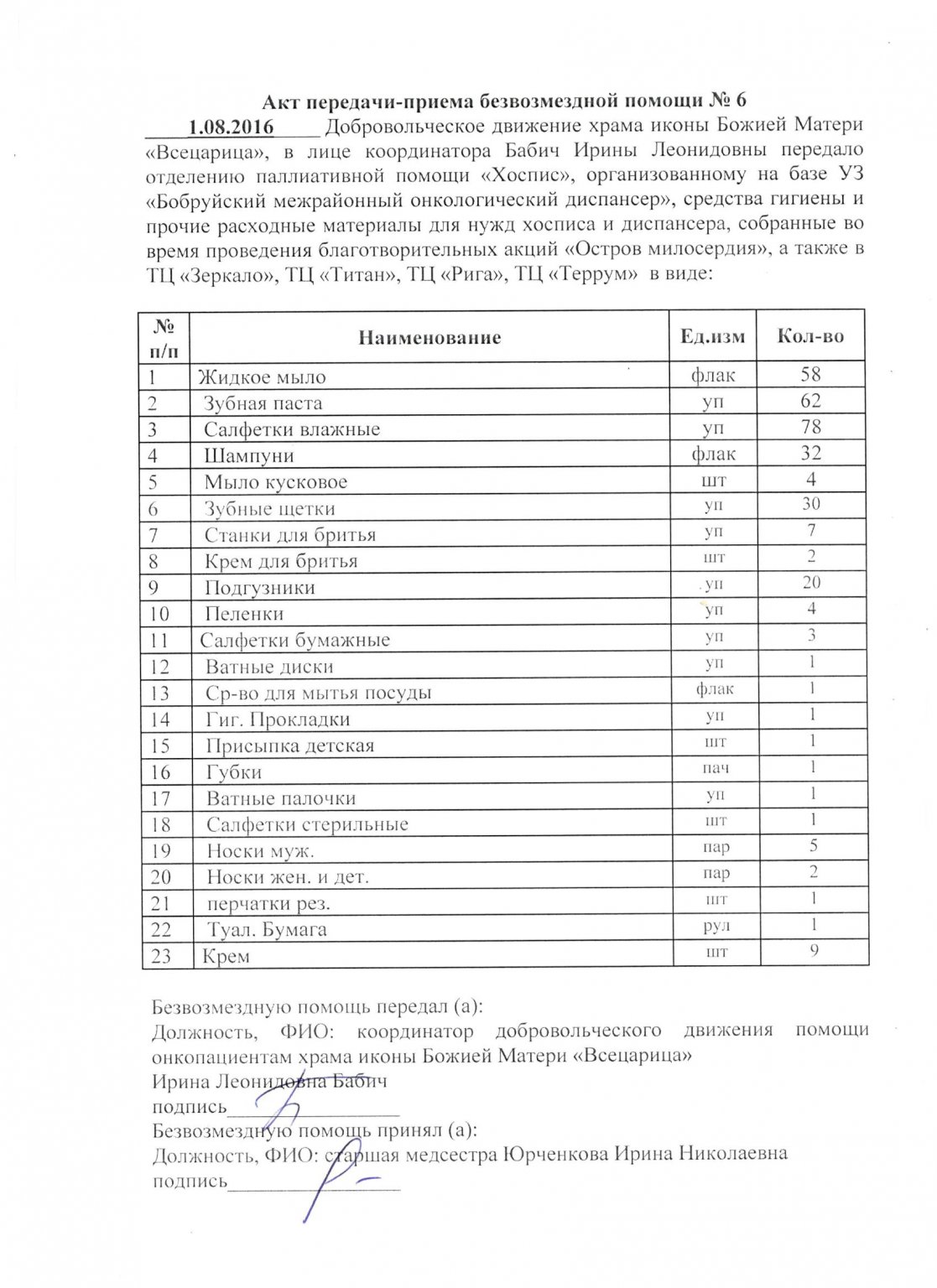 1 августа участники добровольческого движения посетили отделение паллиативной помощи "Хоспис", организованное на базе УЗ "Бобруйский межрайонный онкологический диспансер". Пациентам хосписа и диспансера были переданы средства гигиены, собранные во время проведения благотворительных акций "Остров милосердия", а также акций в ТЦ "Зеркало", ТЦ "Титан", ТЦ "Рига", ТЦ "Террум".