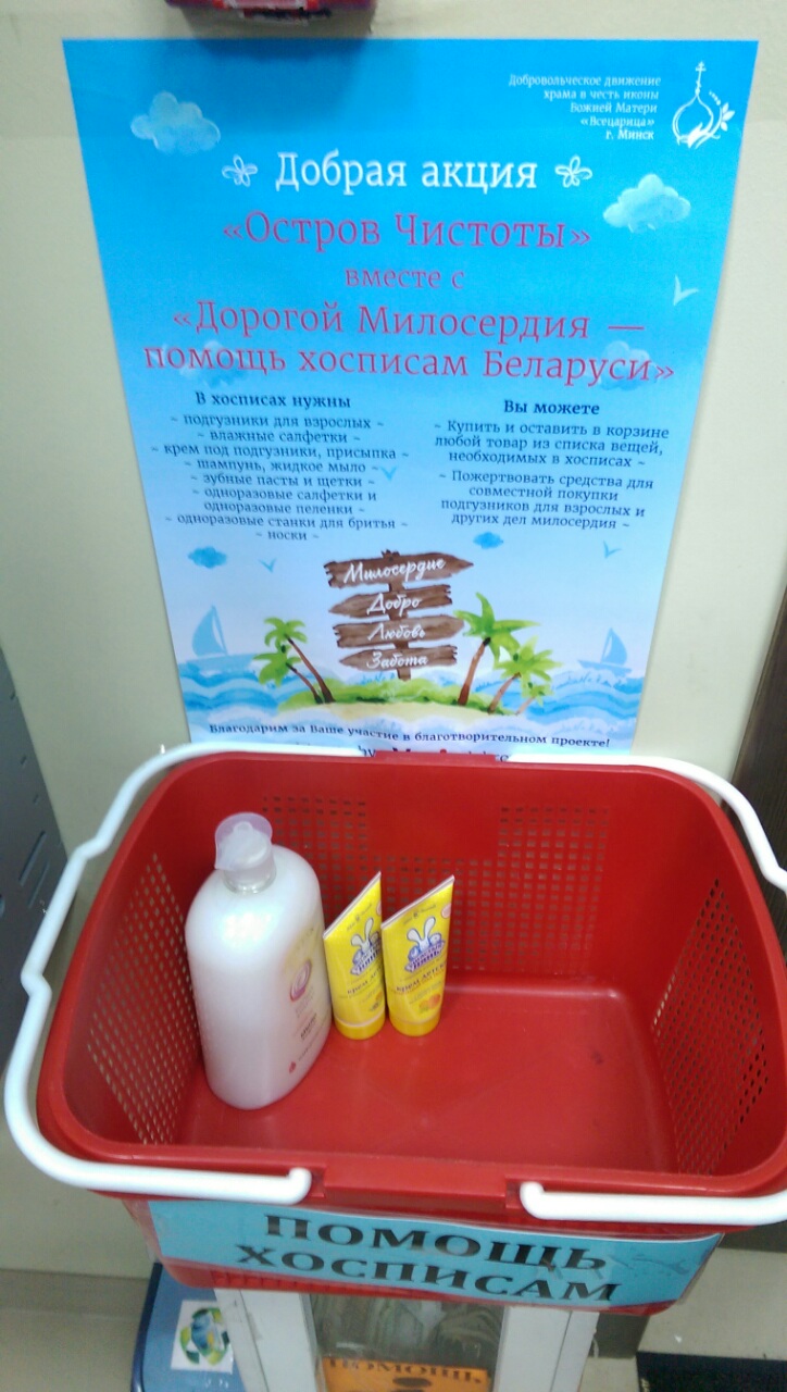В магазинах сети "Остров чистоты", расположенных в Минске, продолжается акция «Остров чистоты» вместе с «Дорогой Милосердия – помощь хосписам Беларуси», стартовавшая 15 августа. Целью акции является сбор вещей и средств гигиены для пациентов хосписов Беларуси. Для этого в каждом дискаунтере «Остров чистоты» установлены специальные корзины для сбора всех необходимых вещей.